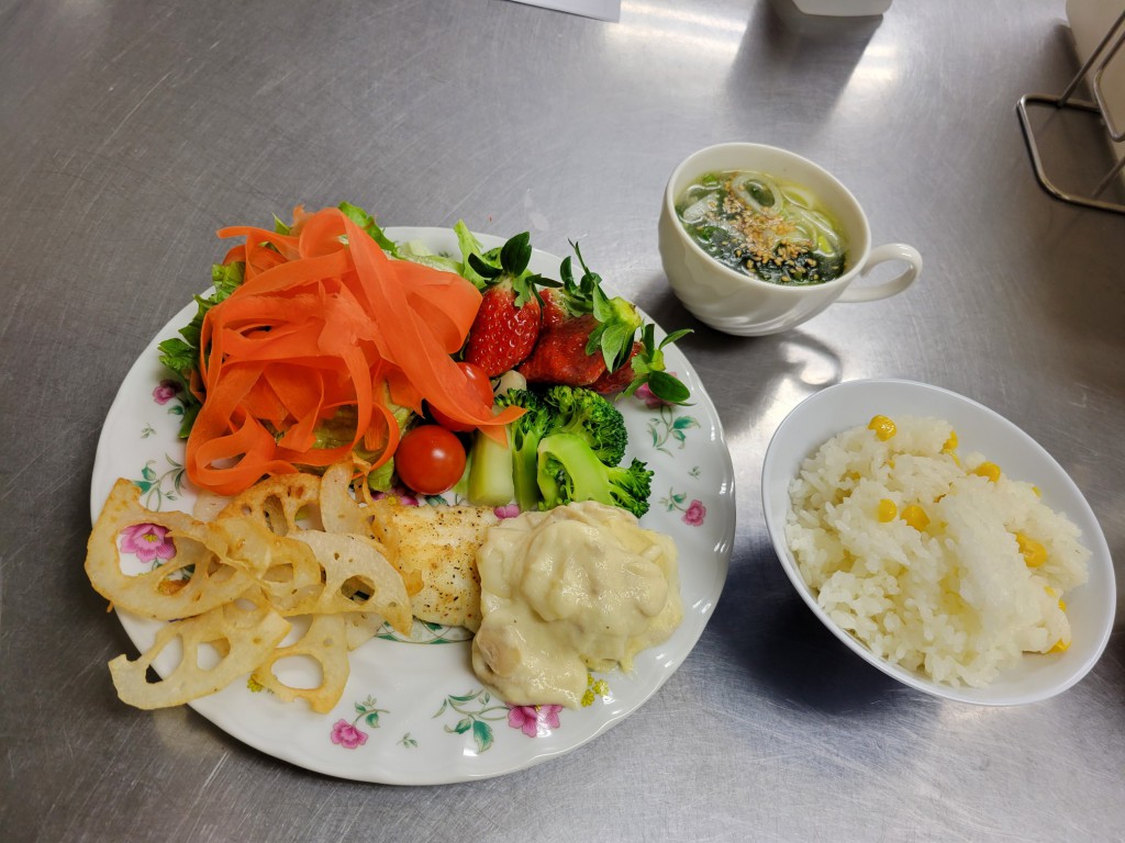 料理教室では、栄養士 健康管理士 食育指導士の有松悦子先生を招いて、福島県沖で水揚げされたヒラメを使って「ヒラメのムニエルホワイトソース添え」をメインディッシュに、福島県産のブロッコリーのサラダなどを調理しました。