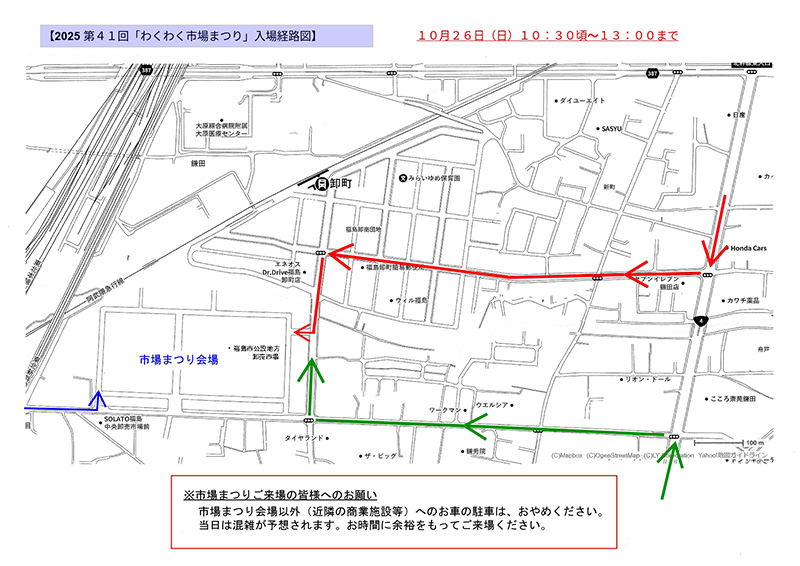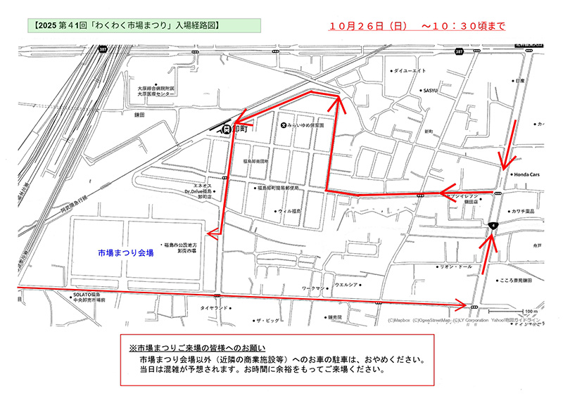 当市場としても、会場レイアウトの見直しなどにより、お客様駐車場の増設確保に努力しておりますが、地域の皆様をはじめ、会場周辺の道路を通行される皆様には、ご不便をおかけすることが予想されますので、ご理解とご協力をお願いいたします。